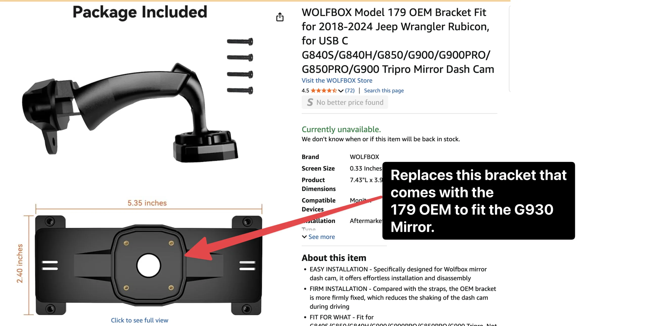 Wolfbox G930 10″ Mirror Bracket for 2018-2024 Jeep Wrangler Bracket Model 179 Adapter – Gladiator