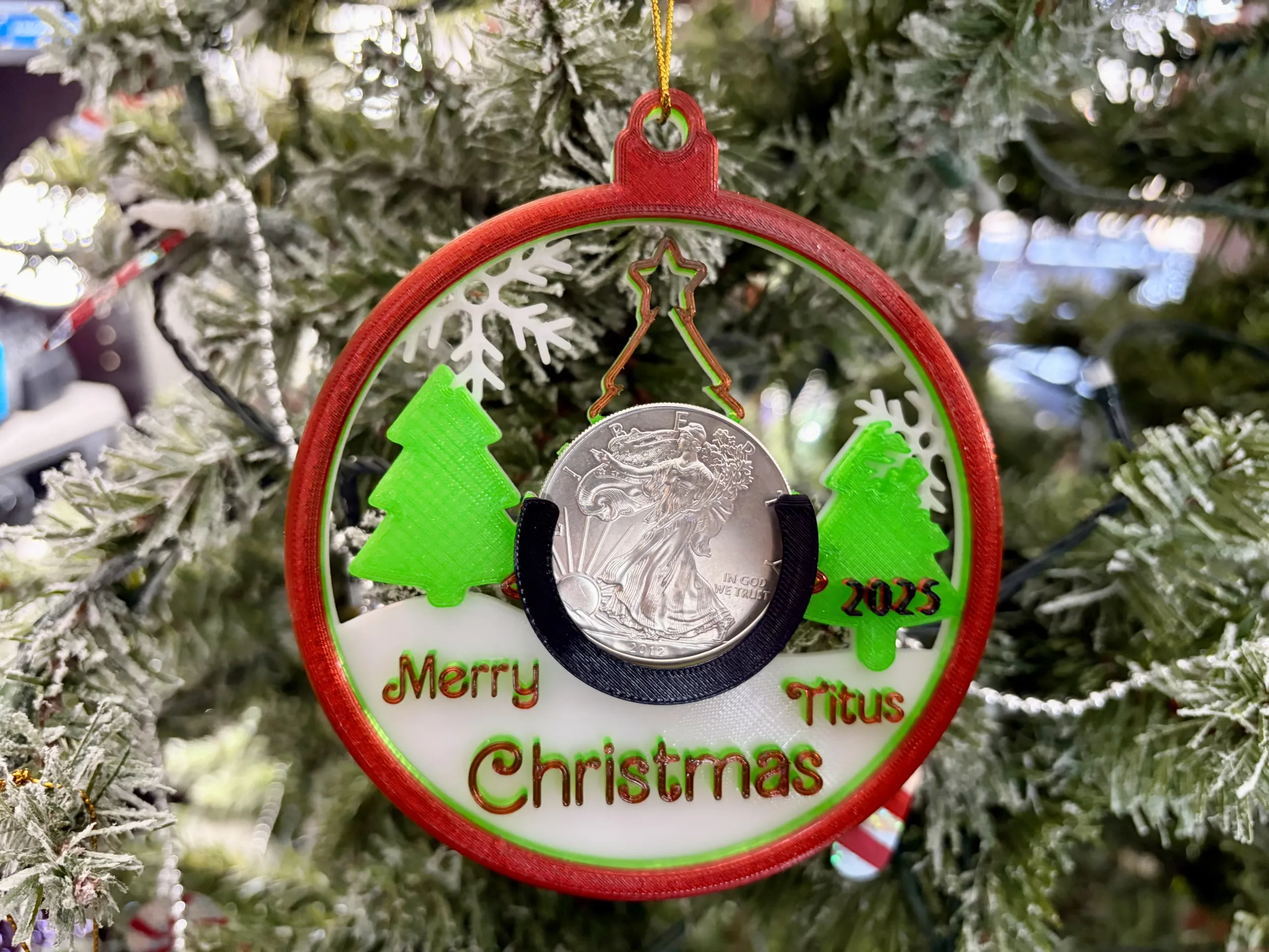 Create a one of a kind Christmas Ornament for your that special silver dollar coin stacker. Add your own custom text that’s unique and is sure to please that person who is hard to buy for, or to create a lasting memory year after year on the tree!